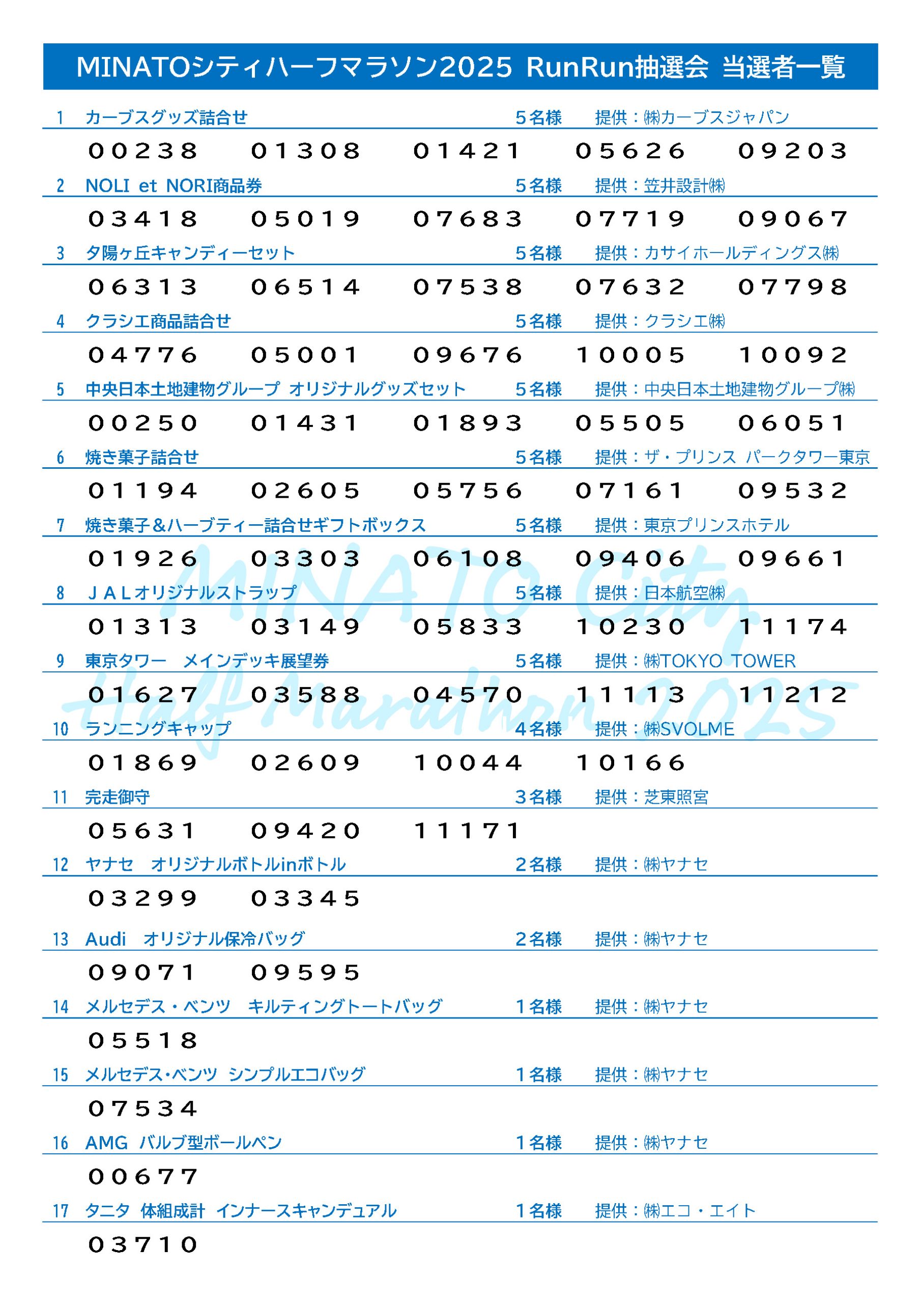 RunRun抽選会 当選結果発表 RunRun抽選会の当選者一覧を掲載いたしました。 ご当選された皆様、おめでとうございます! 当日、景品をお渡しできなかった方につきましては、近日中に事務局より発送します📦 到着まで今しばらくお待ちください。
