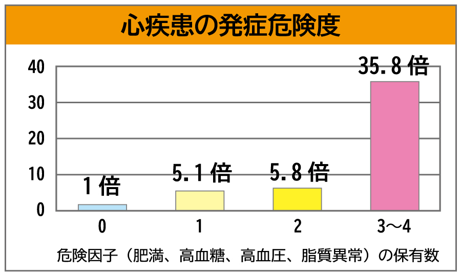 また、心疾患の場合、肥満、高血糖、高血圧、高脂血症の危険因子がない人の危険度を1とすると、危険因子を1つ持っている場合は5.1倍、2つ持っている場合は5.8倍、3~4個持っている場合35.8倍になるという報告があります。