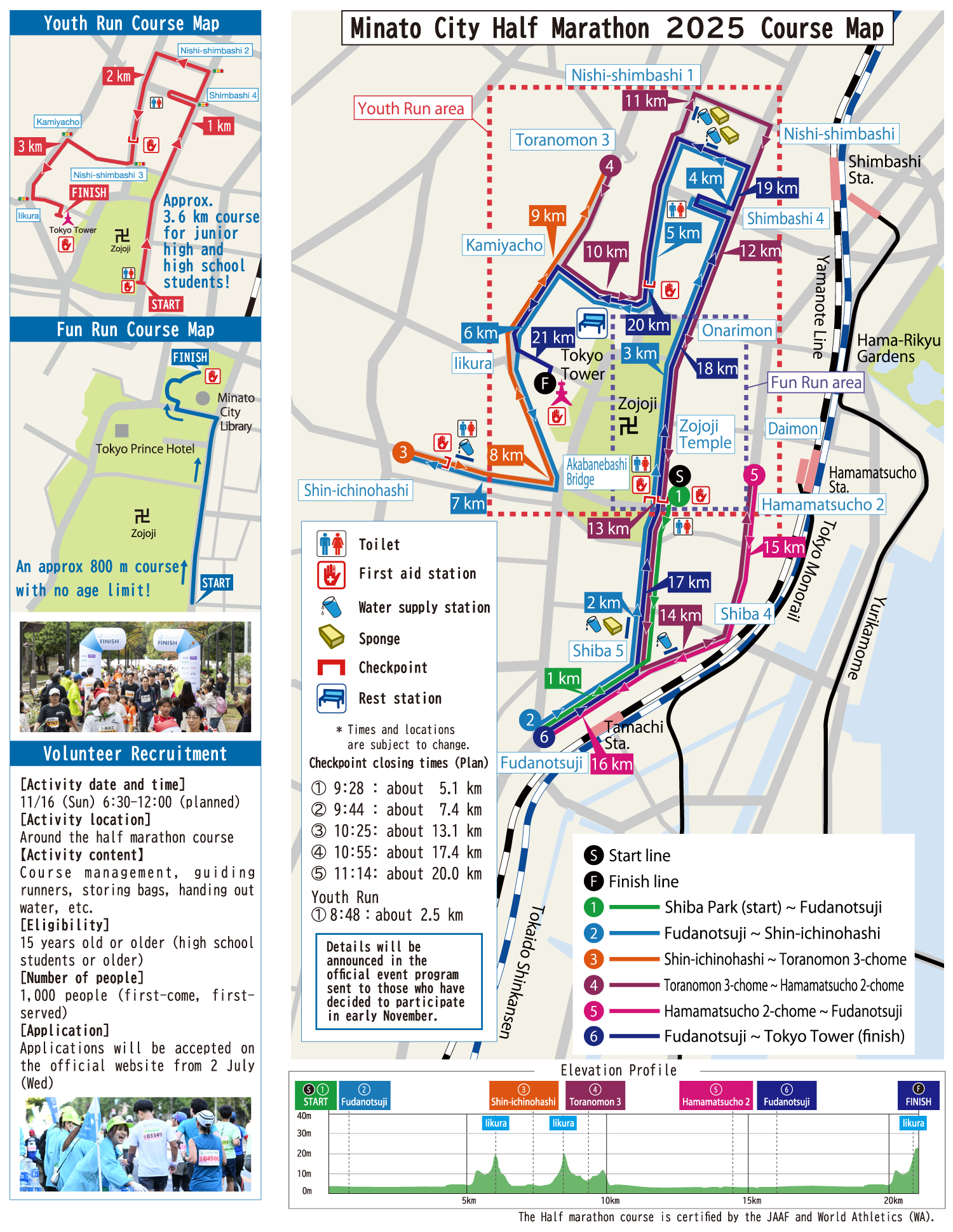 - The Fun Run starts near Minato City Shiba Park, goes north along Hibiya-dori Avenue, turns left at the Minato City Shiba Koen 3-chome intersection, and finishes inside, Tokyo Metropolitan Shiba Park No.4 (on the north side of Minato City Library).