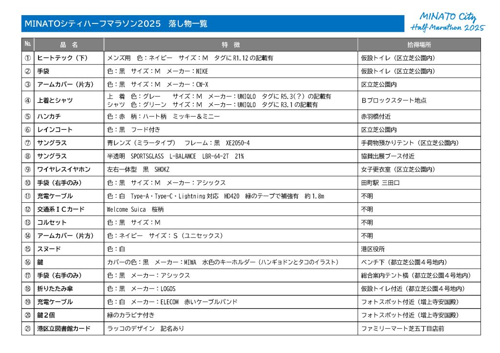 大会当日の落し物について MINATOシティハーフマラソン2025当日、会場周辺で拾得した落し物をお預かりしています。 12月26日(金)までにご連絡がない場合は事務局にて処分させていただきますので、あらかじめご了承ください。 お心当たりのある方は港区マラソン実行委員会事務局(☎03-5770-1400)までご連絡ください。